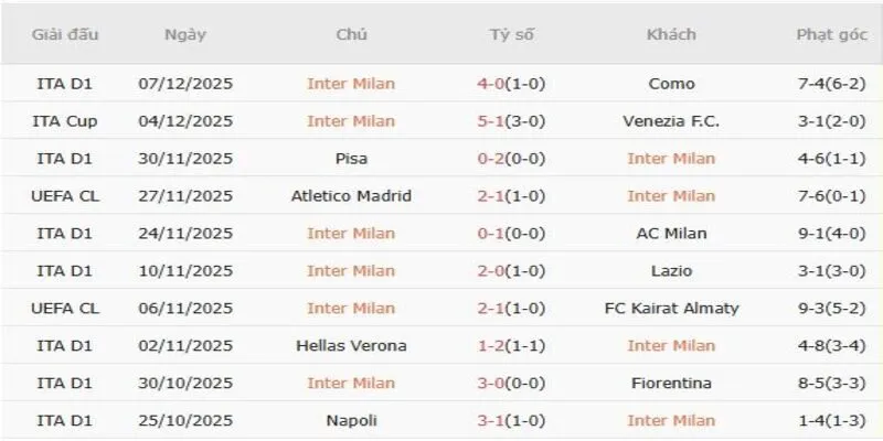 Thống kê 5 trận gần nhất của Inter Milan