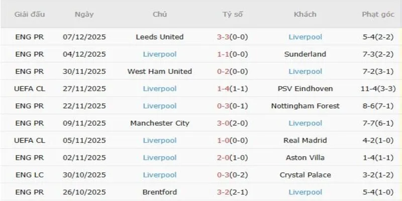 Thống kê 5 trận gần đây của Liverpool